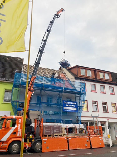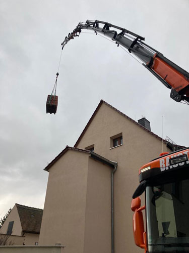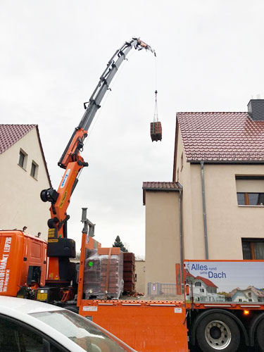 Wir entladen die Baustoffe punktgenau da, wo sie gebraucht werden. Das spart auf der Baustelle Platz und Zeit und damit bares Geld. Dachziegel liefern wir mit unseren Hochkranfahrzeugen direkt auf´s Dach. Ohne zwischenlagern und zusätzlichen Transportaufwand. Mit Hilfe von Dachböcken können wir die Lieferung gleich auf dem Dach verteilen und der Dachdecker kann sofort mit dem Eindecken beginnen.